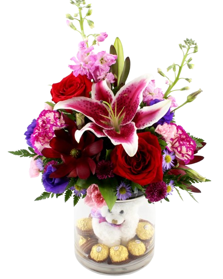 Hand-crafted with fresh flowers, this beautiful flower arrangement includes stargazer lilies, red roses, light pink carnations, lavender poms, pink stock and assorted greens.