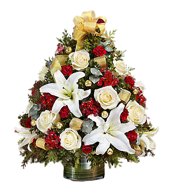Hand-crafted with fresh flowers, this beautiful flower arrangement includes white lillies, white roses, and red carnations. It also includes greenery and gold decorative accents, such as ribbon and gold ornaments, giving it a festive, holiday-themed appearance.
