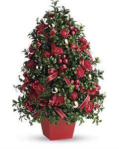 Hand-crafted, this beautiful flower arrangement includes elegant english boxwood stems that are hand arranged to look like a mini Christmas tree, complete with all the festive trimmings!