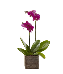 The Enchanting Orchids arrangement is a graceful and long-lasting gift, showcasing vibrant purple orchid blooms complemented by two lush succulents at the base. A delicate butterfly rests atop, adding a whimsical touch to this exotic and elegant display.