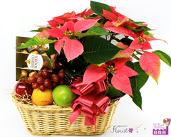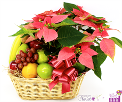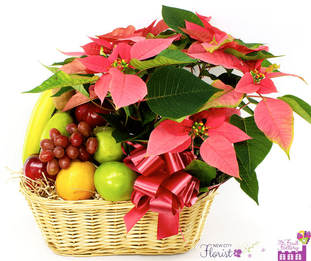 Enjoy a mix of whole fresh fruits including oranges, apples, grapes & more! Also included is a beautiful Poinsettia Plant, the perfect gift this Holiday Season!