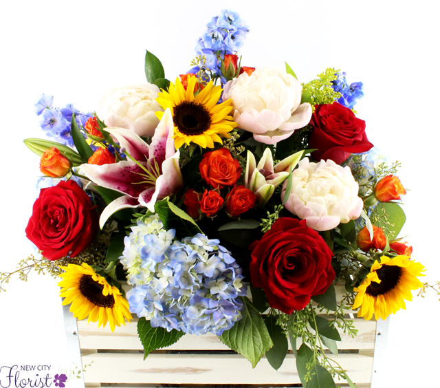 Need to make a great first impression? Look no further than this beautiful flower arrangement that includes stargazer lilies, blue hydrangea, sunflowers, red roses, pink peonies, orange spray roses, blue delphinium, and assorted greens.