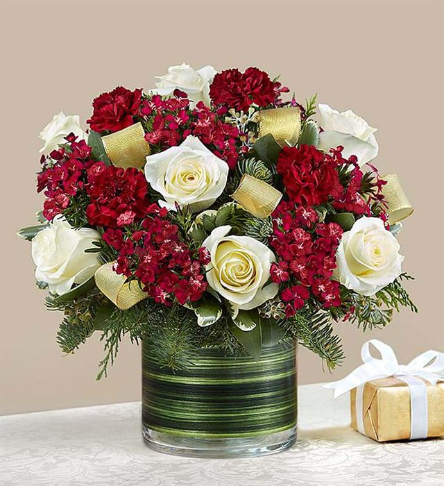 Designed with fresh flowers, this beautiful flower arrangement includes red roses, white carnations, waxflower, and assorted Christmas greens.
