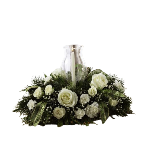 Designed with fresh flowers, this beautiful flower arrangement includes white roses, white spray roses, white carnations and baby's breathe with greens and a holiday ribbon.