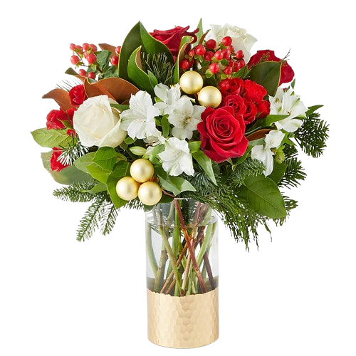 Designed with fresh flowers, this beautiful holiday floral arrangement includes white roses, white alstroemerias, red spray roses, red berries, and assorted christmas greens.