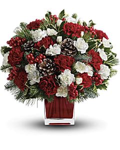 Designed with fresh flowers, this beautiful flower arrangement includes red and white carnations accented with pinecones and assorted greens.