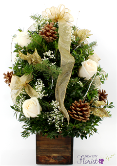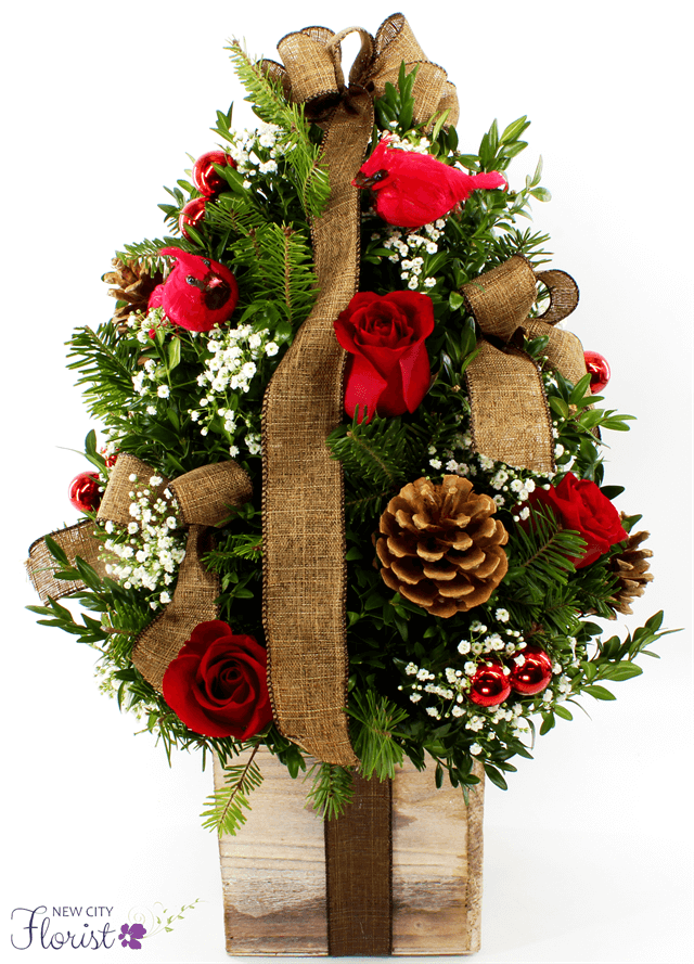 Hand-crafted with fresh flowers, this beautiful flower arrangement includes red roses adorned with pinecones and red cardinals with sparkling ornaments and a glittering gold star on top.