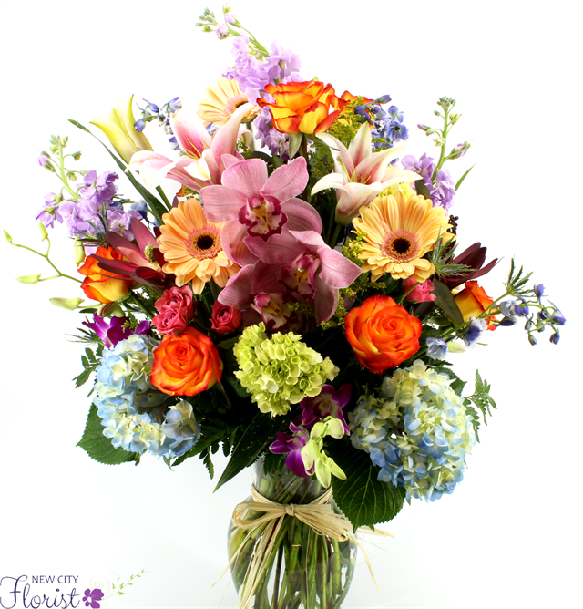 Designed with our highest quality flowers, this beautiful flower arrangement includes pink orchids, purple orchids, blue hydrangea, orange roses, stargazer lilies, blue delphinium, lavender stock and assorted greens.
