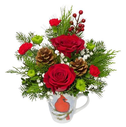 Designed with fresh flowers, this beautiful flower arrangement includes red roses, red mini carnations, baby's breathe, berries, pinecones and assorted greens.