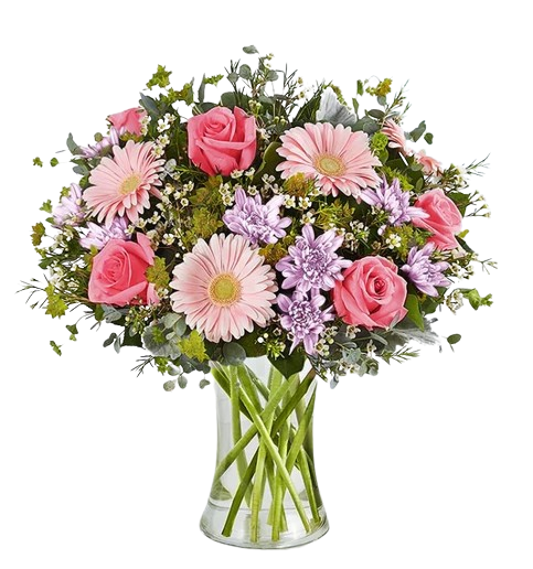 Designed with fresh flowers, this beautiful flower arrangement includes pink gerber daisies, hot pink roses, lavender cushions and assorted greens.
