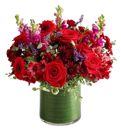 Designed with fresh flowers, this beautiful flower arrangement includes red roses, Peruvian lilies (alstroemerias), mini Gerbera daisies, and cushion poms; purple snapdragons and limonium; and burgundy mini carnations, accented with assorted greenery