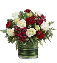 Classic Christmas with a fun, modern twist! 48 red and white roses are gathered together, creating a candy cane swirl, for a fresh floral take on the popular seasonal treat. Joined by lush holiday greens, it’s the best way to get everyone into the holiday spirit.