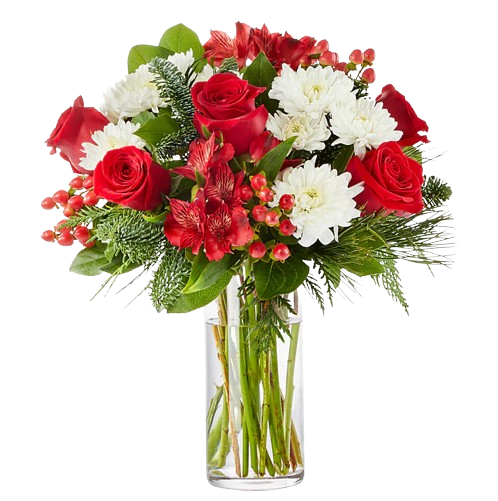 Designed with fresh flowers, this beautiful holiday floral arrangement includes red roses, white cushion poms, red alstromeria, red hypericum berries, and assorted christmas greens.