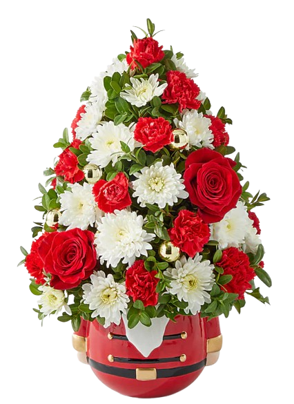 A headturning mini tree fit for a king or queen, this arrangement includes, roses, carnations, and mums, perfect to adorn a holiday table.