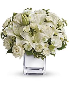 Designed with fresh flowers, this beautiful flower arrangement includes white lilies, white roses, white carnations and assorted greens.