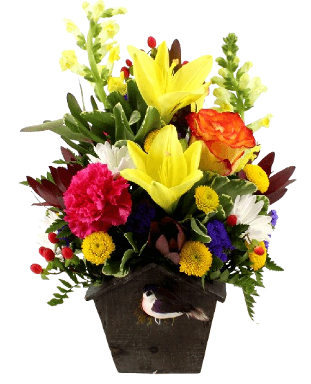 Hand-crafted with fresh flowers, this beautiful flower arrangement includes yellow lilies, orange roses, yellow snapdragons, white daises, and pink carnations, yellow button poms with assorted greens.