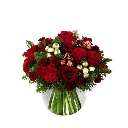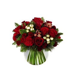 Designed with fresh flowers, this beautiful flower arrangement includes red roses, red spray roses and red carnations accented with gold and red ornaments with Christmas greens.