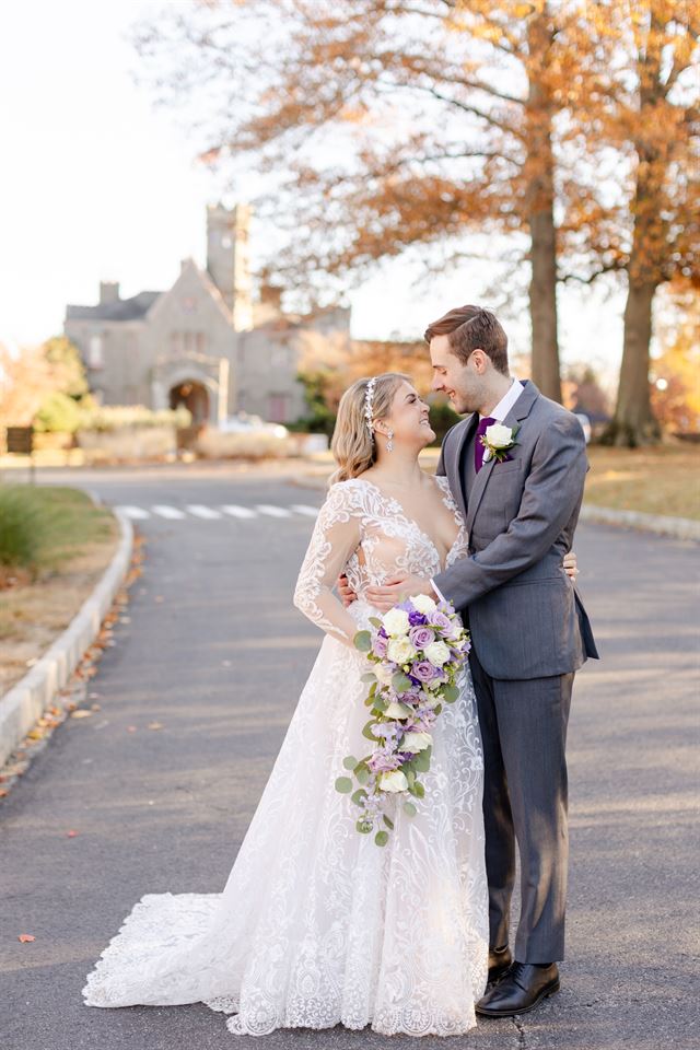Elegant and classic, this clutch-style bridal bouquet is designed with fresh white roses, lavender roses, purple roses, purple lisianthus, and flowing silver dollar eucalyptus for a soft, romantic feel.
