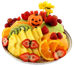 This tasty fruit arrangement includes a dozen chocolate covered strawberries decorated with orange drizzle and pumpkin designs!