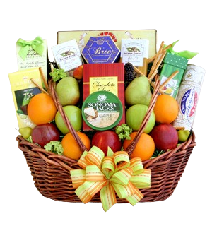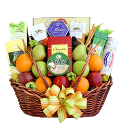 Arranged with fresh fruit, this delicious fruit basket includes apples, pears, oranges, cheese, crackers and other assorted gourmet items.