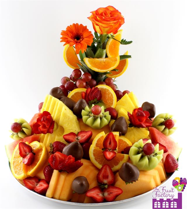Designed with a mix of fresh fruit, this tasty fruit arrangement includes strawberries, chocolate covered strawberries, pineapple slices, honey dew slices, orange slices, cantaloupe slices, watermelon slices, grapes, and kiwi!