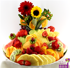 Designed with a mix of fresh fruit, this tasty fruit arrangement includes pineapple slices, honey dew slices, orange slices, cantaloupe slices, watermelon slices, strawberries, grapes, and kiwi!