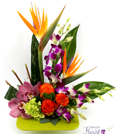 Designed with our highest quality flowers, this beautiful flower arrangement includes birds of paradise, purple orchids, blue dendrobium, blue iris, stargazer lilies, purple snapdragons, yellow roses, green hydrangea and assorted greens.