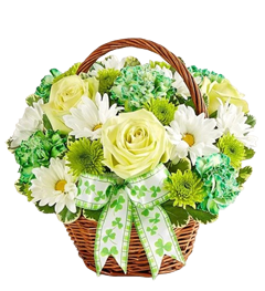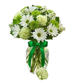 Make their day lucky with our fresh green and white carnations, poms and more in a classic glass vase. It arrives with a removable green carnation they can pin on their lapel for the traditional "wearing of the green".